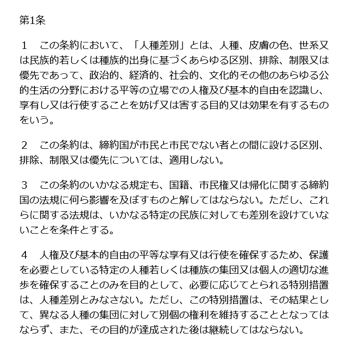 この条約において、「人種差別」とは、人種、皮膚の色、世系又は民族的若しくは種族的出身に基づくあらゆる区別、排除、制限又は優先であって、政治的、経済的、社会的、文化的その他のあらゆる公的生活の分野における平等の立場での人権及び基本的自由を認識し、享有し又は行使することを妨げ又は害する目的又は効果を有するものをいう。