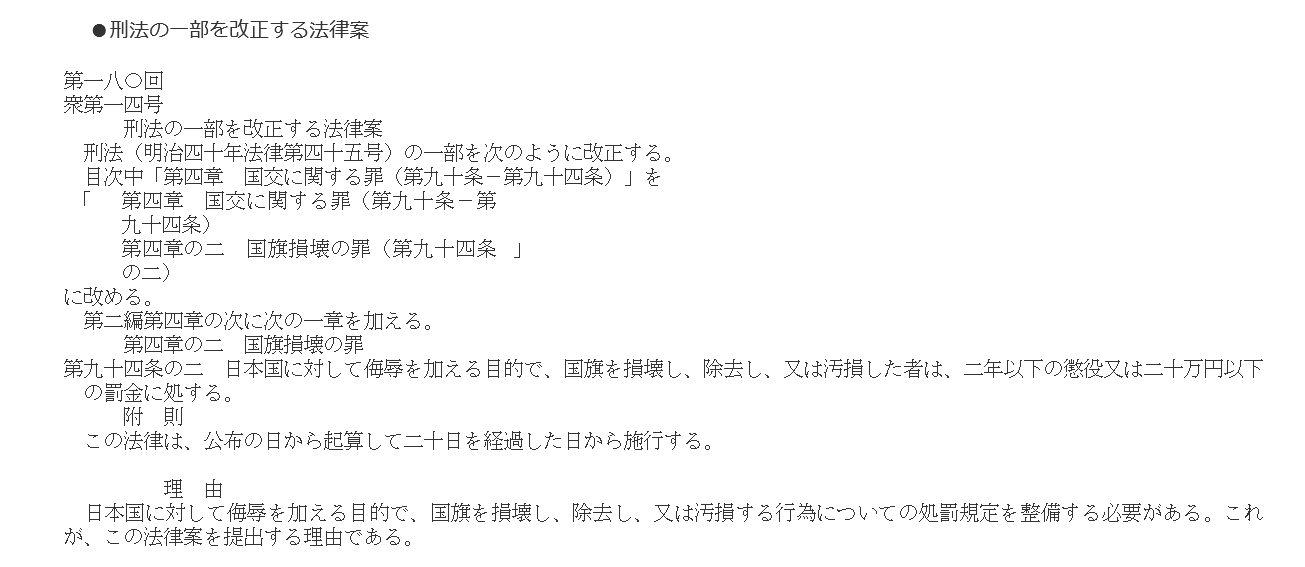 現行法にはすでに、刑法第92条の外国国章損壊罪が存在します。これは、外国の国旗や国章を損壊・侮辱する行為を処罰する規定です。