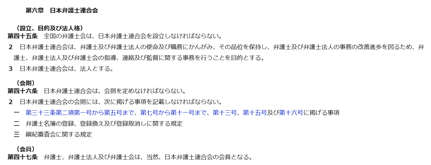 日弁連は、弁護士法に基づいて設立された団体であり、同法45条2項は、弁護士の使命と職務にかんがみ、その品位を保持し、弁護士業務の改善進歩を図るため、弁護士や弁護士会に対する指導・連絡・監督に関する事務を行うことを目的とする団体であると定めています。また、同法1条は、弁護士の使命として「基本的人権の擁護」と「社会正義の実現」を掲げています。