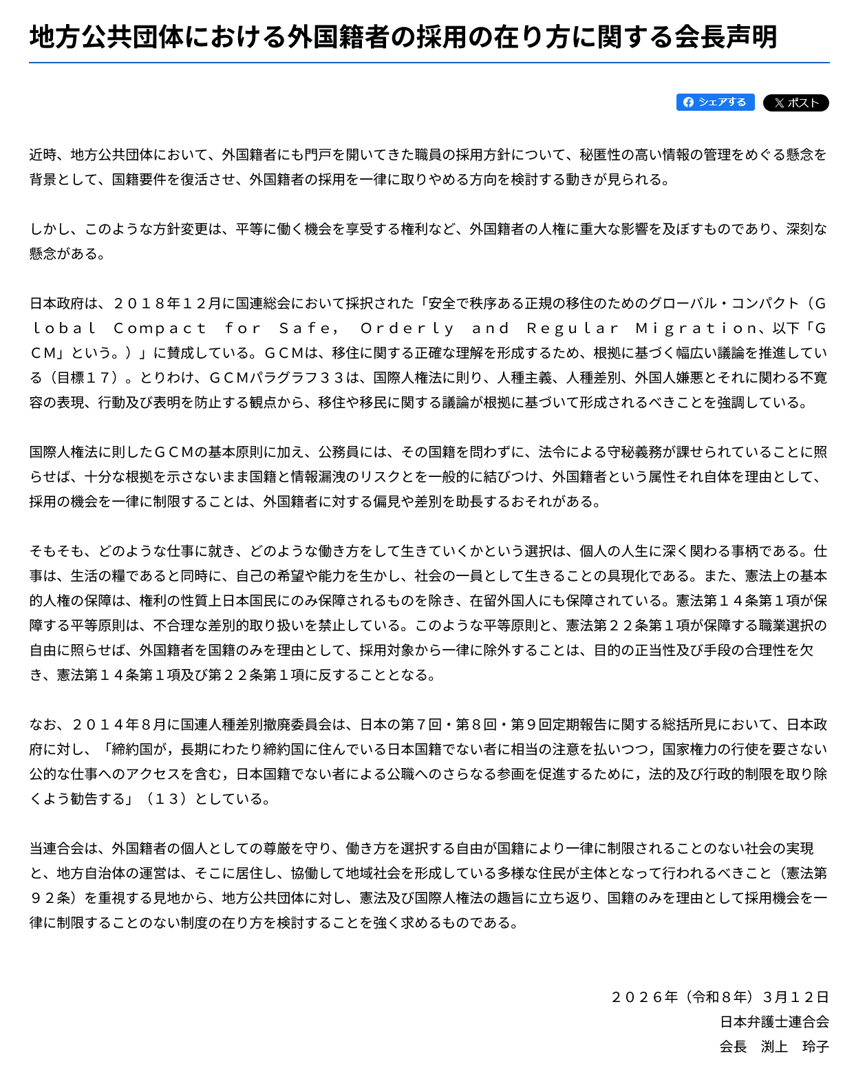 声明では、平等原則や職業選択の自由を理由に、こうした制限は憲法の趣旨に反する可能性があると指摘されています。また、国際人権法や国連文書などにも言及し、外国籍者の公的分野への参加を広げるべきだという立場が示されています。